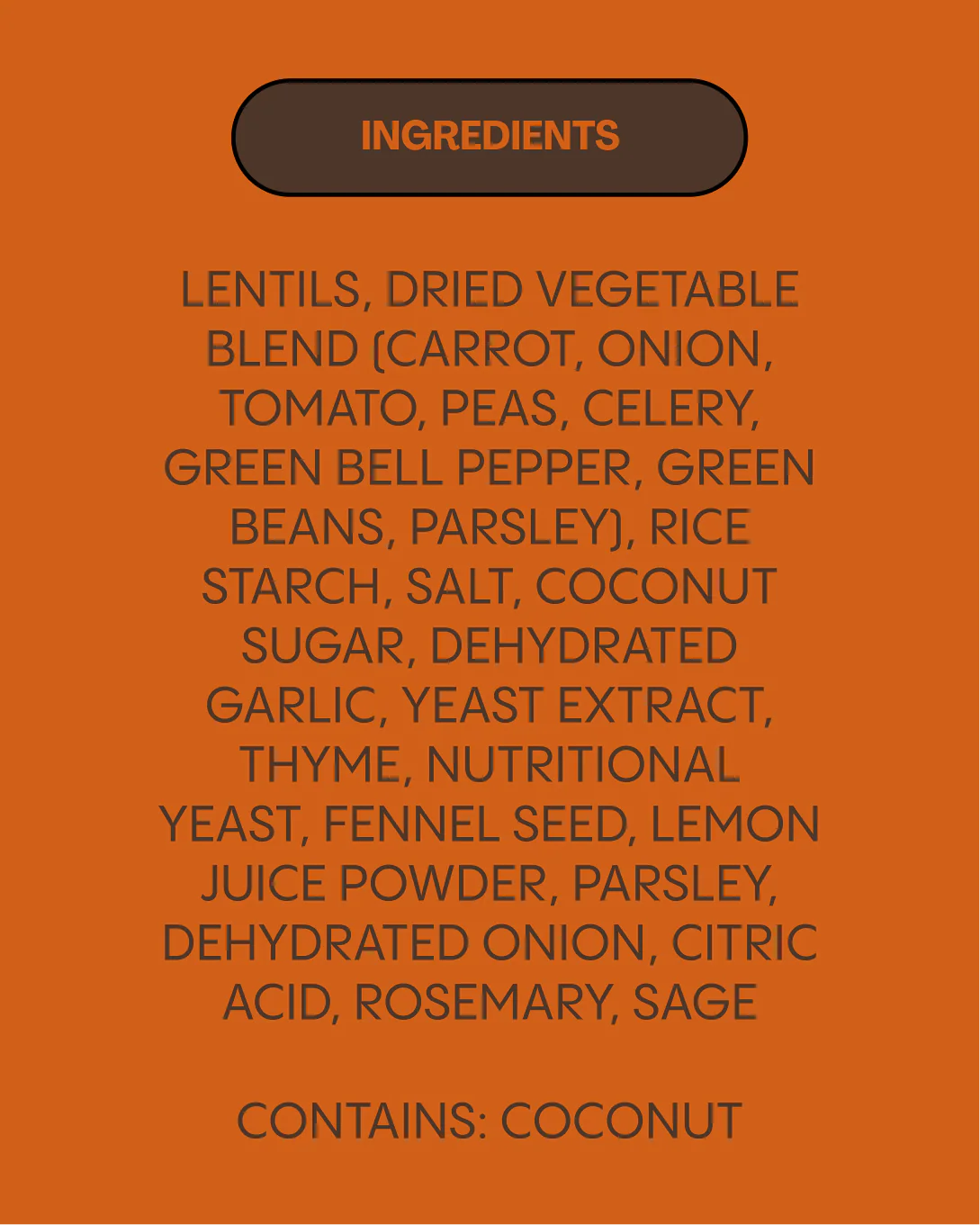 LENTILS, DRIED VEGETABLE BLEND (CARROT, ONION, TOMATO, PEAS, CELERY, GREEN BELL PEPPER, GREEN BEANS, PARSLEY), RICE STARCH, SALT, COCONUT SUGAR, DEHYDRATED GARLIC, YEAST EXTRACT, THYME, NUTRITIONAL YEAST, FENNEL SEED, LEMON JUICE POWDER, PARSLEY, DEHYDRATED ONION, CITRIC ACID, ROSEMARY, SAGE